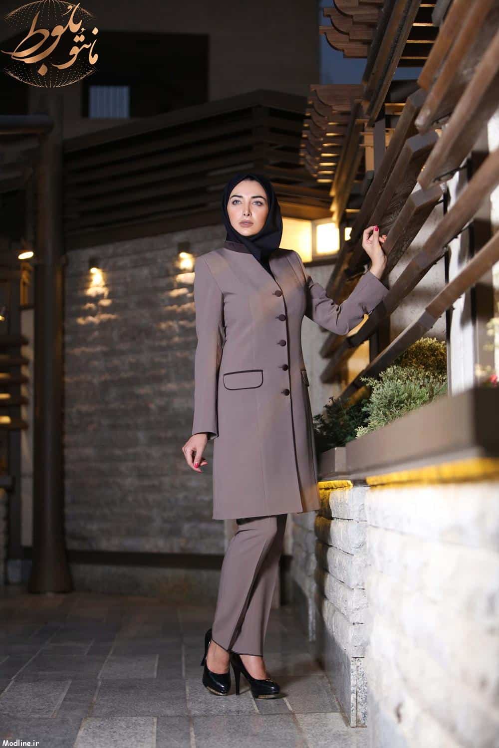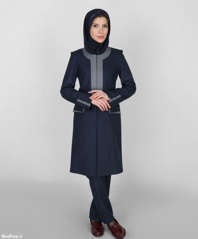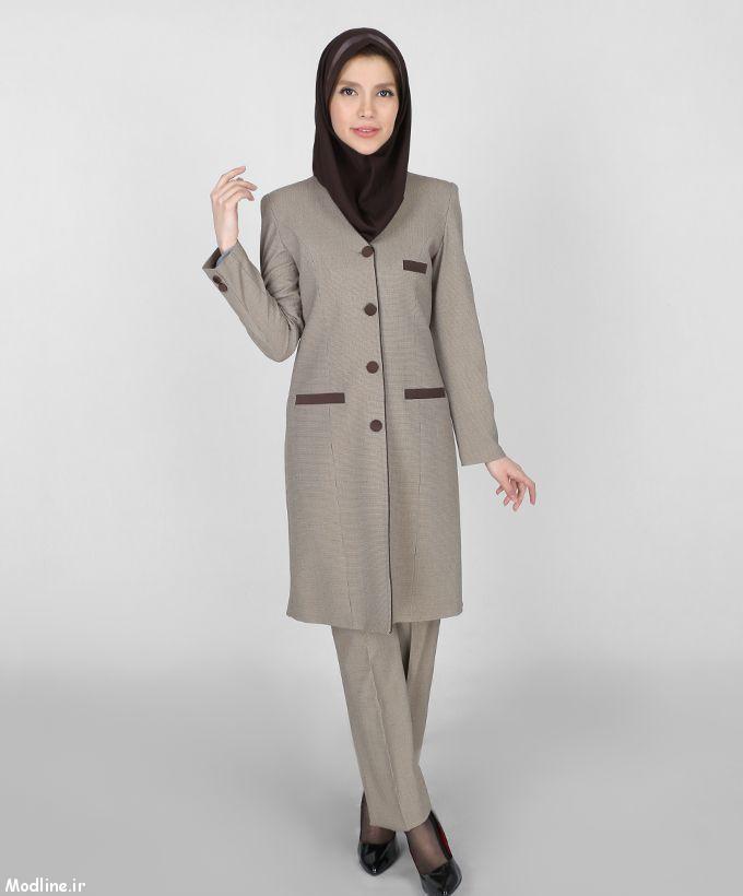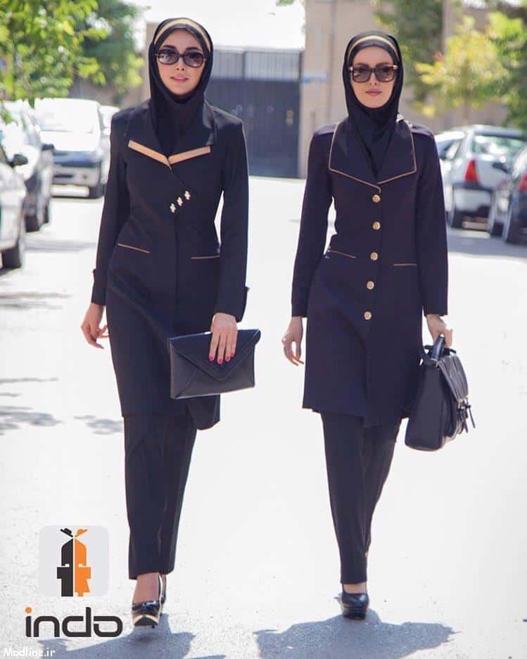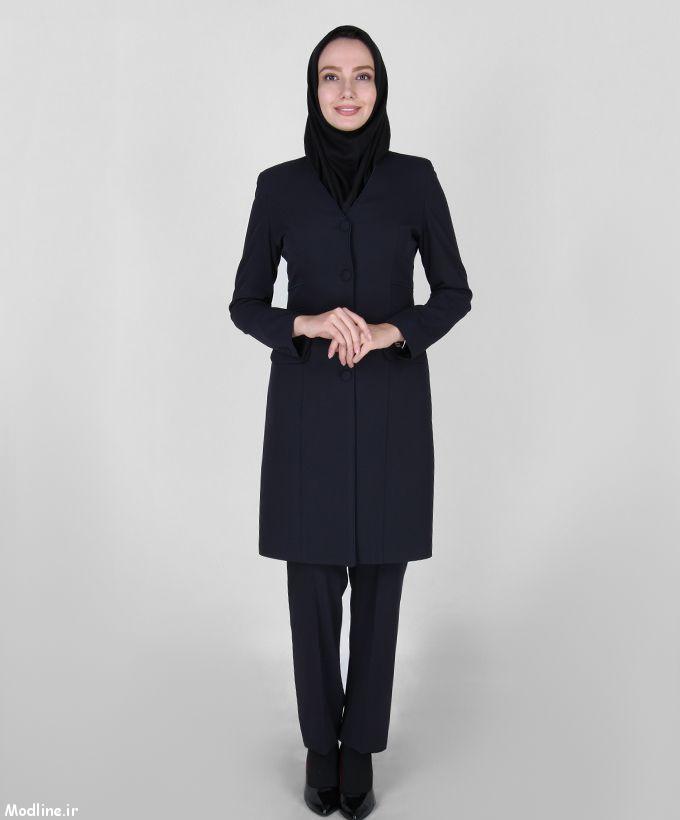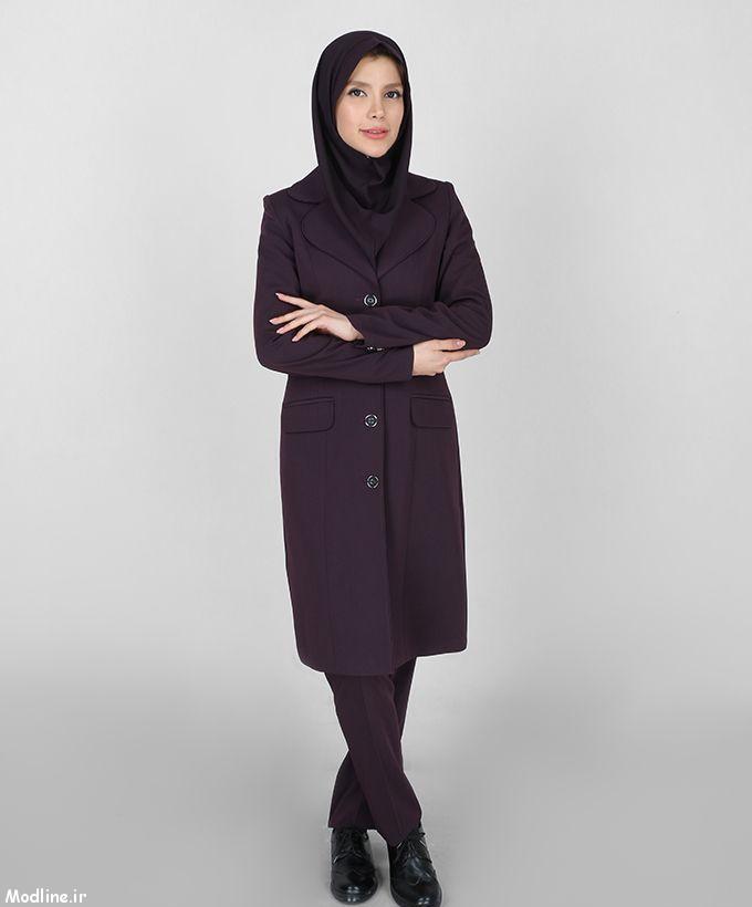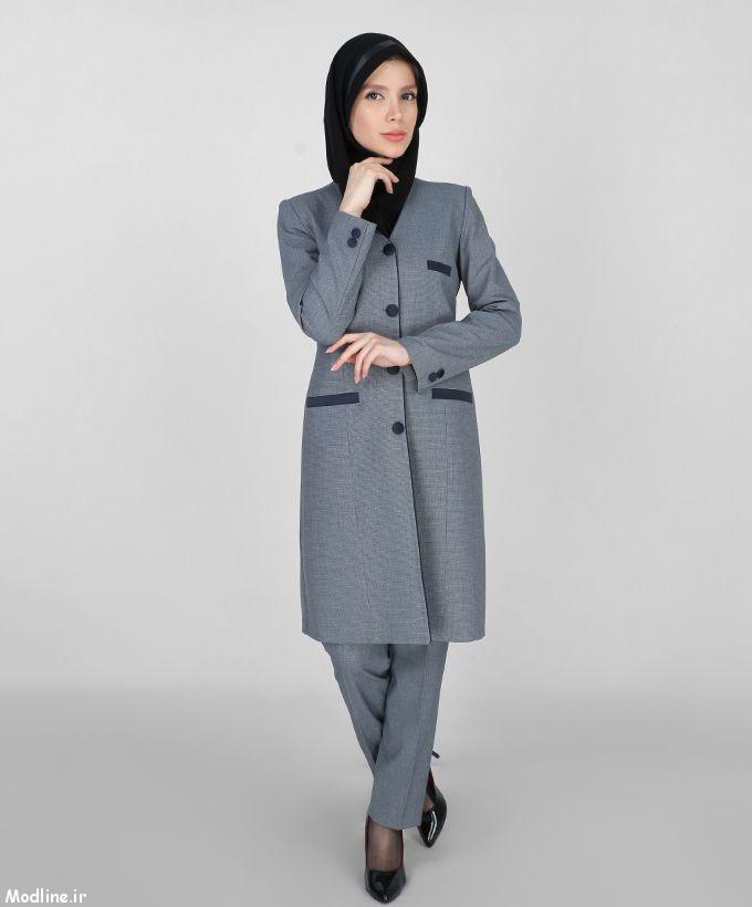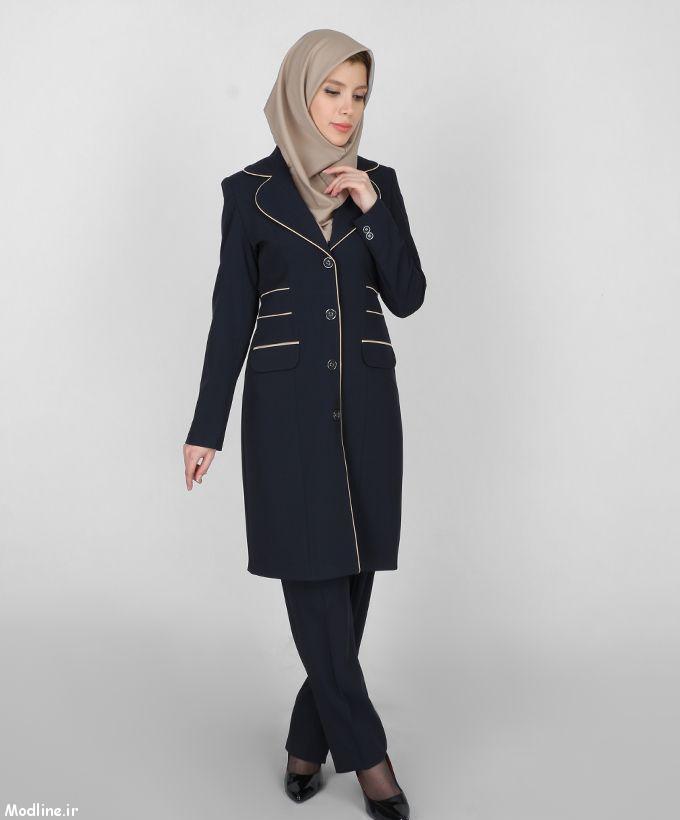 اگر در جایی کار میکنید که جز کتگوری محیط کار رسمی است، بهترین گزینه انتخاب یک مانتو و شلوار ست در رنگ تیره مانند مشکی یا طوسی یا قهوهای یا سورمهای است. مقنعه شما میتواند همرنگ مانتو یا در یک رنگ نزدیک به آن باشد. مثلا استفاده از مقتعه مشکی با مانتو و شلوار طوسی استایل شیکی برای شما میسازند. همچنین مقنعه سورمهای در کنار مانتو و شلوار مشکی ترکیب خوبی است. اصراری نیست که تمام لباسها و اکسسوریها مانند کیف و کفشتان از یک رنگ باشند اما در محیط کار رسمی باید از رنگ های نزدیک به هم استفاده کنید. مثلا اگر مانتو و شلوارتان در یک رنگ هستند، کیف، کفش و مقنعه هم از یک رنگ باشند. قد شلوار کاملا مطابق قد خودتان باشد و از کفش راحت با لژ کوتاه و یک کیف ساده استفاده کنید. در محیط رسمی خوش دوخت بودن لباسها و جنس پارچهای که لباس از آن دوخته شده است، میتواند بیشترین جلوه را داشته باشد و باعث شود که خوش پوشتر به نظر برسید. در ادامه چند نمونه از این استایل را مشاهده میکنید.