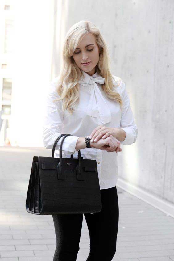 - هر چه در خصوص کفش گفتیم در مورد کیف هم صدق میکند. بهتر است به دنبال کیفی باشید که ظاهر رسمی و اسپرتتری داشته باشد و از کیفهای مجلسی دوری کنید. همچنین کیف از نظر رنگ باید با مانتو و شلوارتان همخوانی داشته باشد. البته در استایل نیمه رسمی میتوانید از رنگهای روشن تر و رنگ های سرد در کیف و اکسسوری استفاده کنید. برای مثال میتوانید کیف جین یا آبی را با مانتو شلوار مشکی یا طوسی ست کنید.